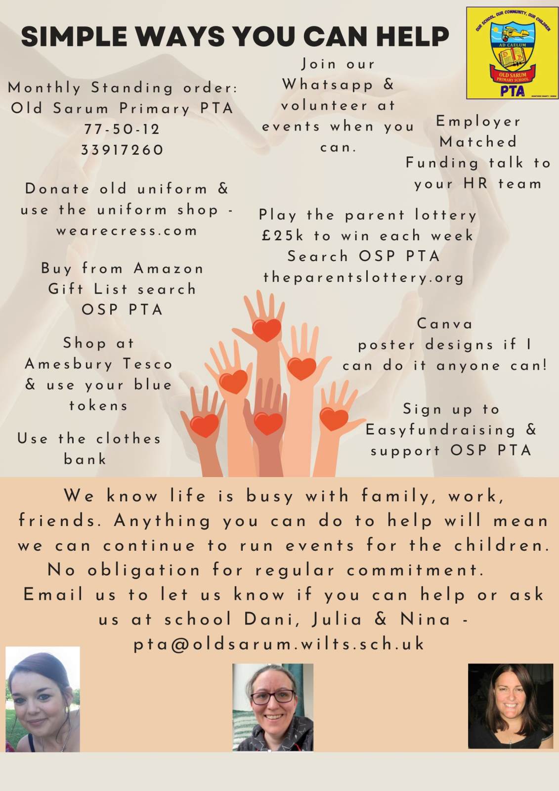 We are always keen to welcome new people and their ideas for how to raise funds and how they can be spent, to the team (committee or simply event helpers) and would be delighted to hear from anyone that can spare a few hours throughout the year to help. If your company or business is able to offer any help through donations, raffle prizes, volunteering or matched funding please contact us email: pta@oldsarum.wilts.sch.uk.