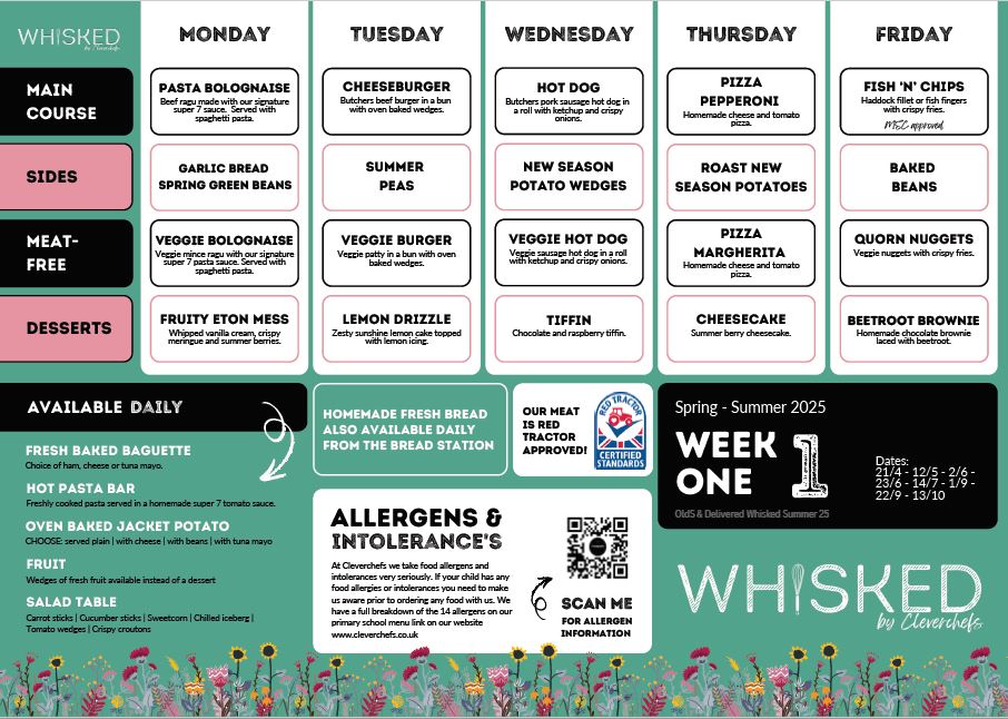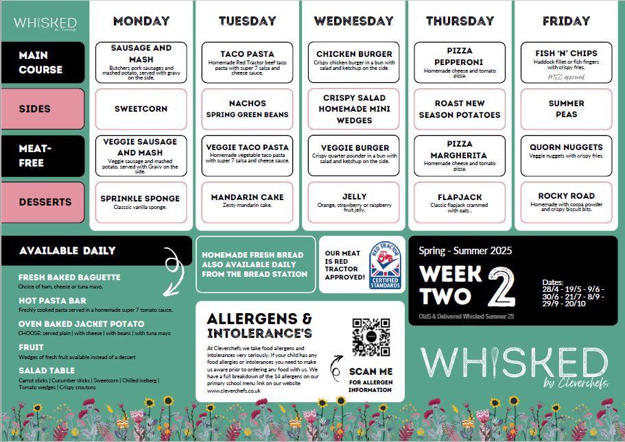 We offer hot school meals produced by our catering provider, Cleverchefs. There is a charge for each two course meal for children in years 3 – 6 and meals are free to all children in Reception, Year 1 and Year 2.